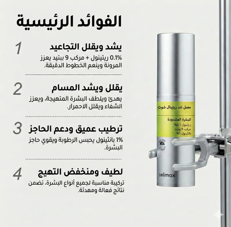 ✅ شد فوري للبشرة: يحتوي على مركب الببتيد (Matrixyl 3000) اللي يعبي الخطوط الرقيقة ويشد الوجه المرتخي. ✅ قاهر المسامات: يضيق المسامات الواسعة بشكل ملحوظ ويخلي ملمس وجهك ناعم وحريري. ✅ نضارة فورية: يقضي على البهتان ويعطي لمعة صحية للبشرة. ✅ آمن وما ينشفش: مدعم بـ "البانثينول" لترطيب وتهدئة البشرة ومنع أي تهيج.